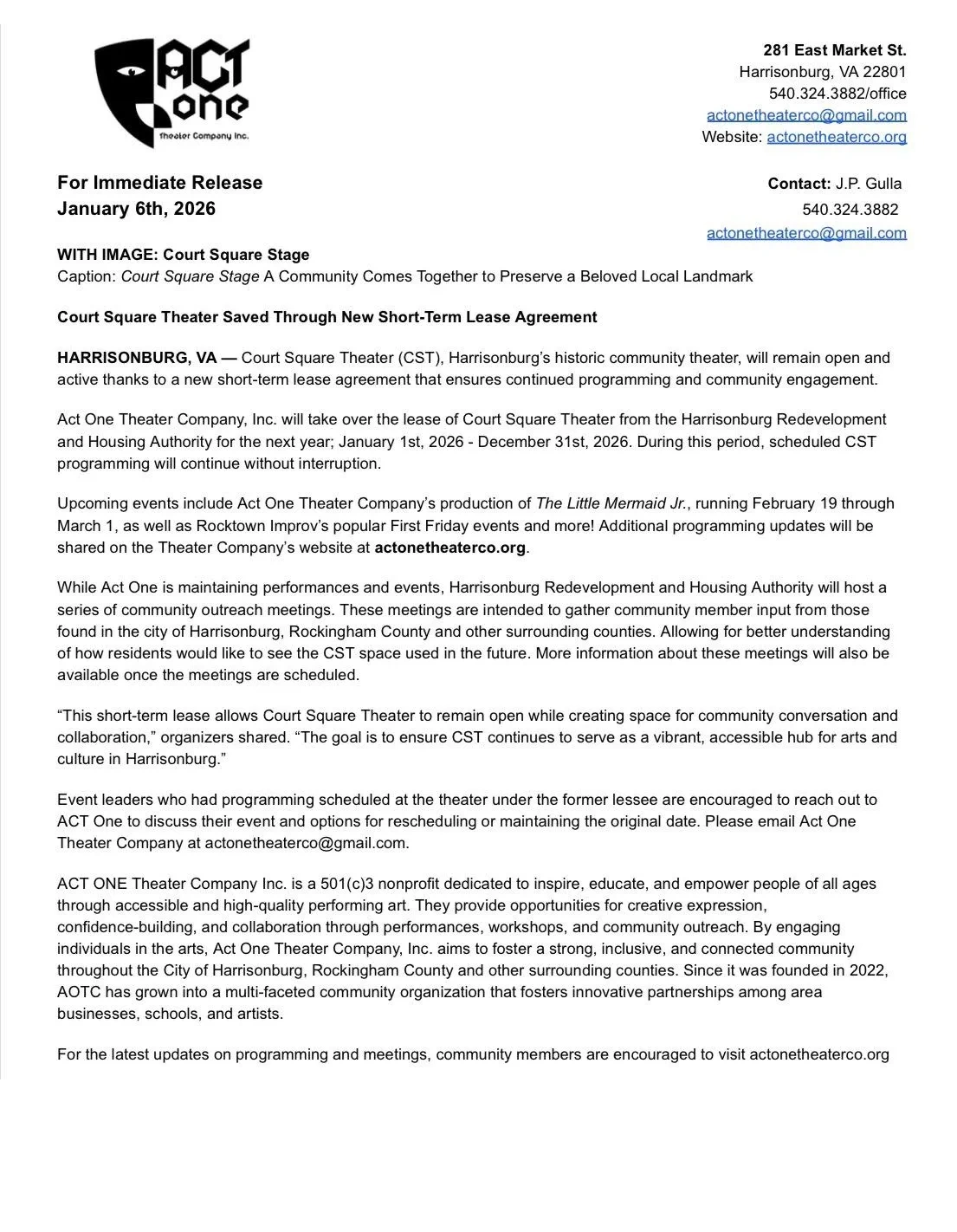 We’re thrilled to share that Court Square Theater will remain open and active throughout 2026. Act One Theater Company will take over operations for the year, ensuring that performances, events, and community programming continues.